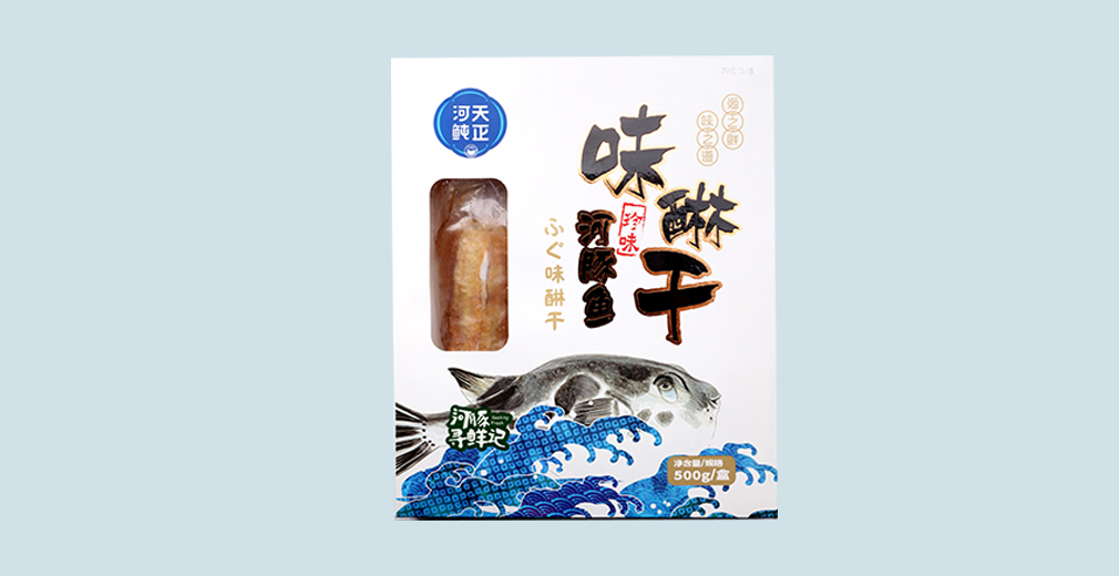 味醂魚干 天正味醂河豚魚干,用料嚴格、工序考究、傳承古法。我們取河豚魚精肉,去骨去膜、標準切割,經數天低溫風干,祛除魚肉內水分,再添加味醂調味料,浸入鮮甜美味。解凍后,烤箱烘烤便可食用。